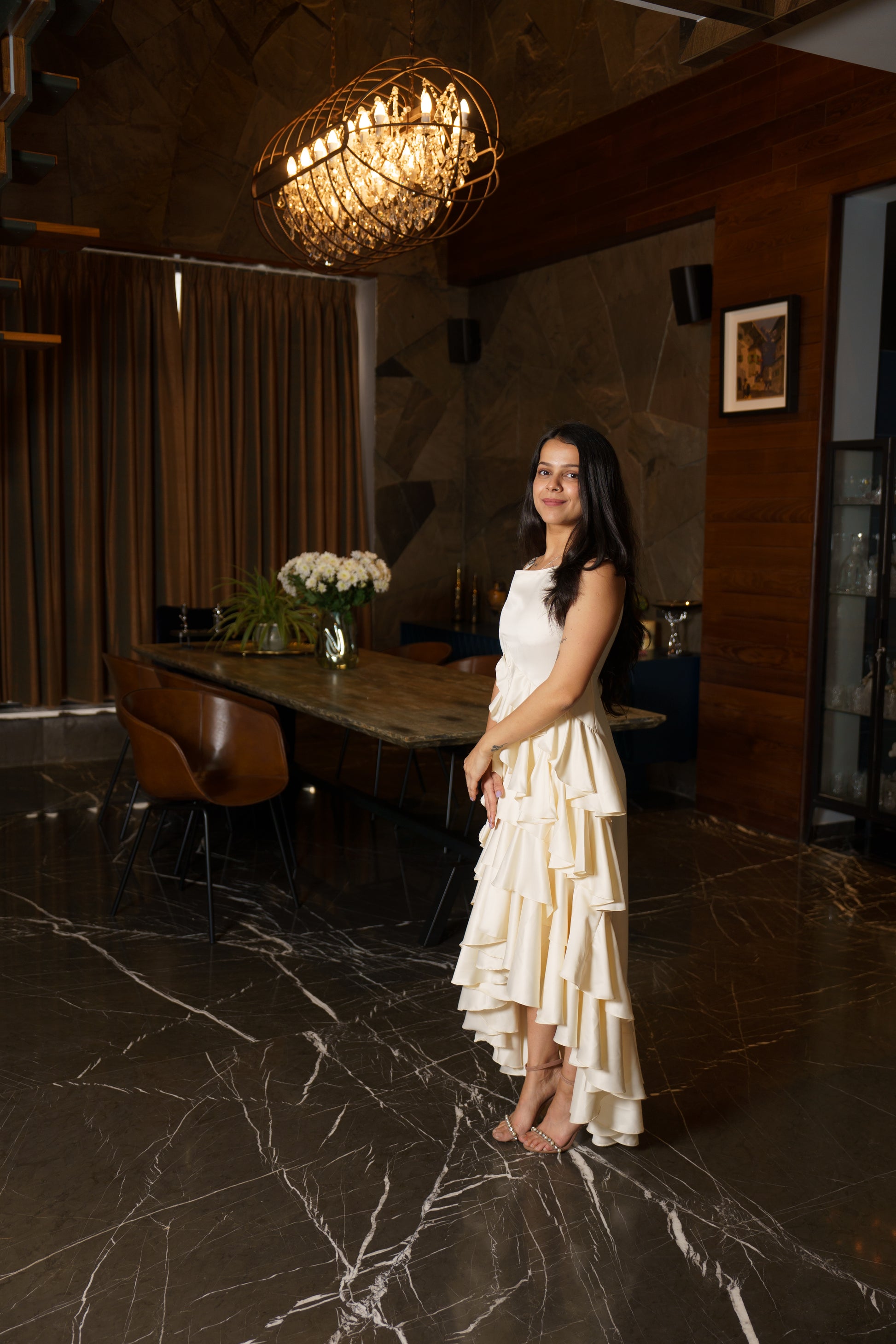 of each handmade flounce, which drapes and flows with exceptional movement. The floor-length