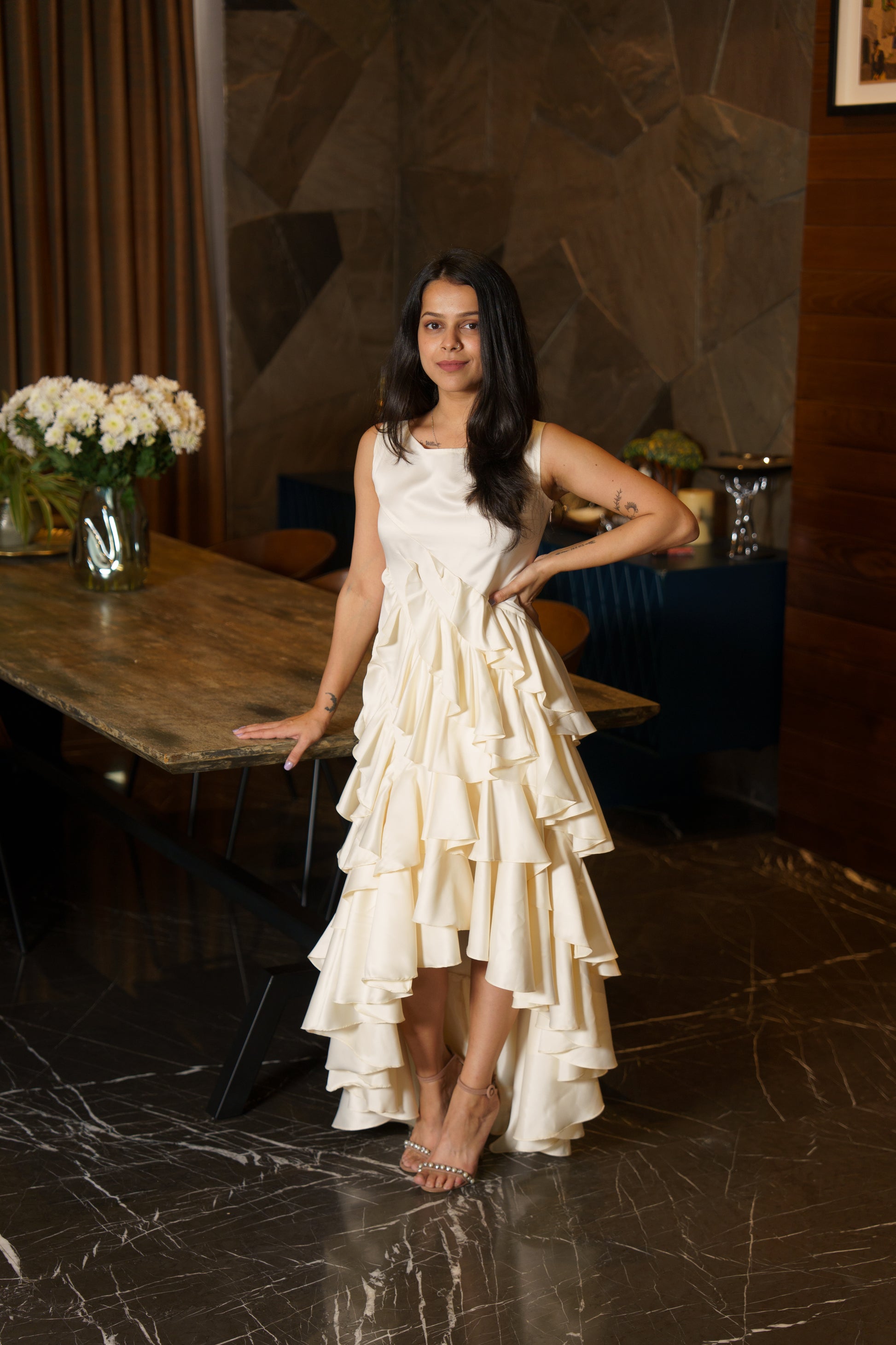 The "Avalanche Cascade" dress is a breathtaking, asymmetrical masterpiece