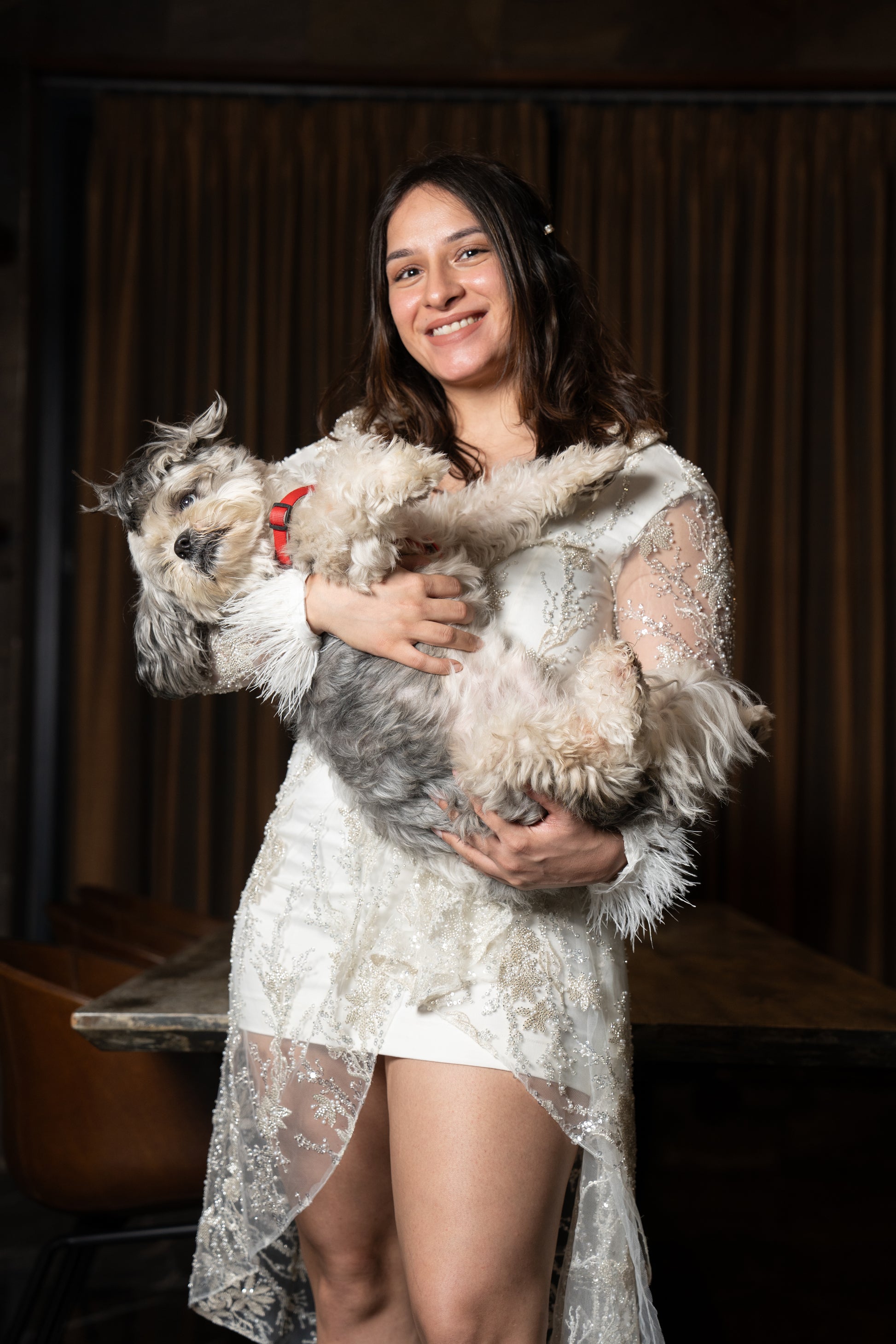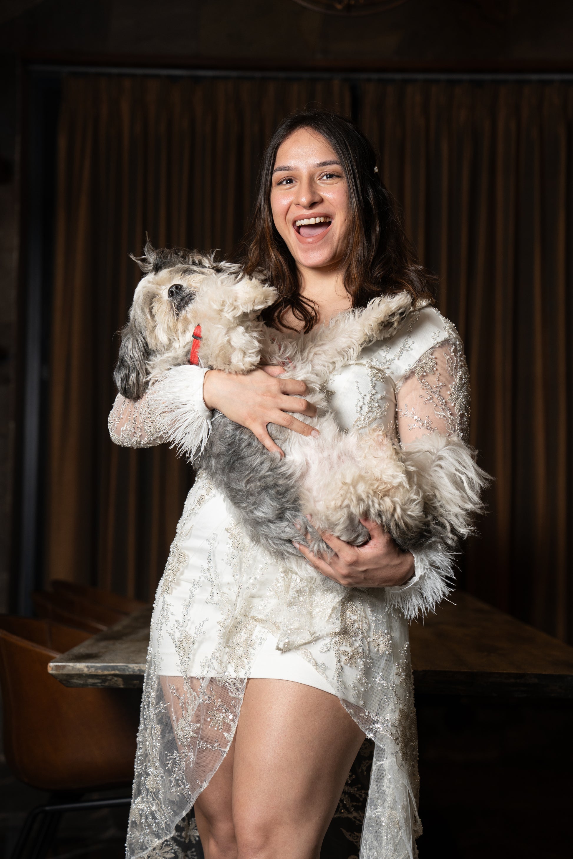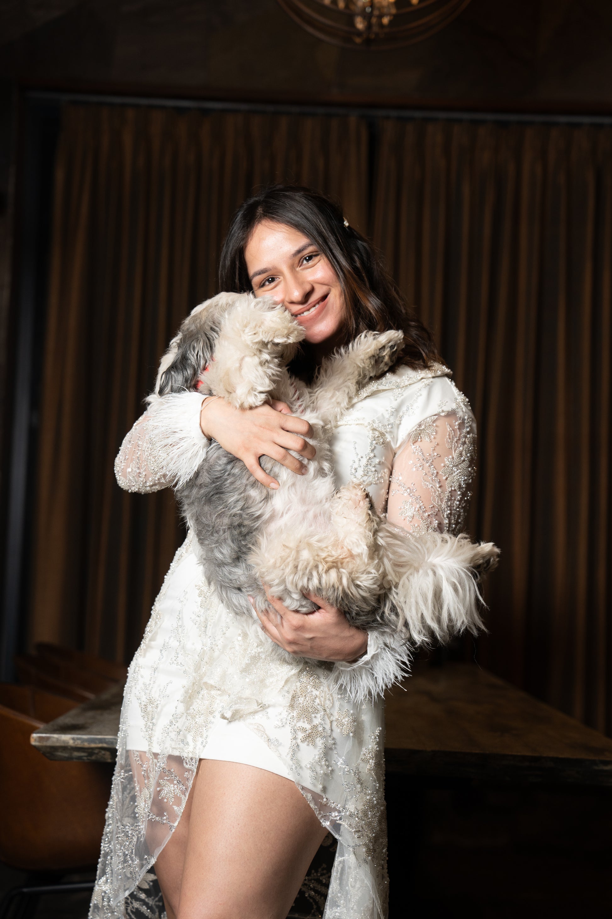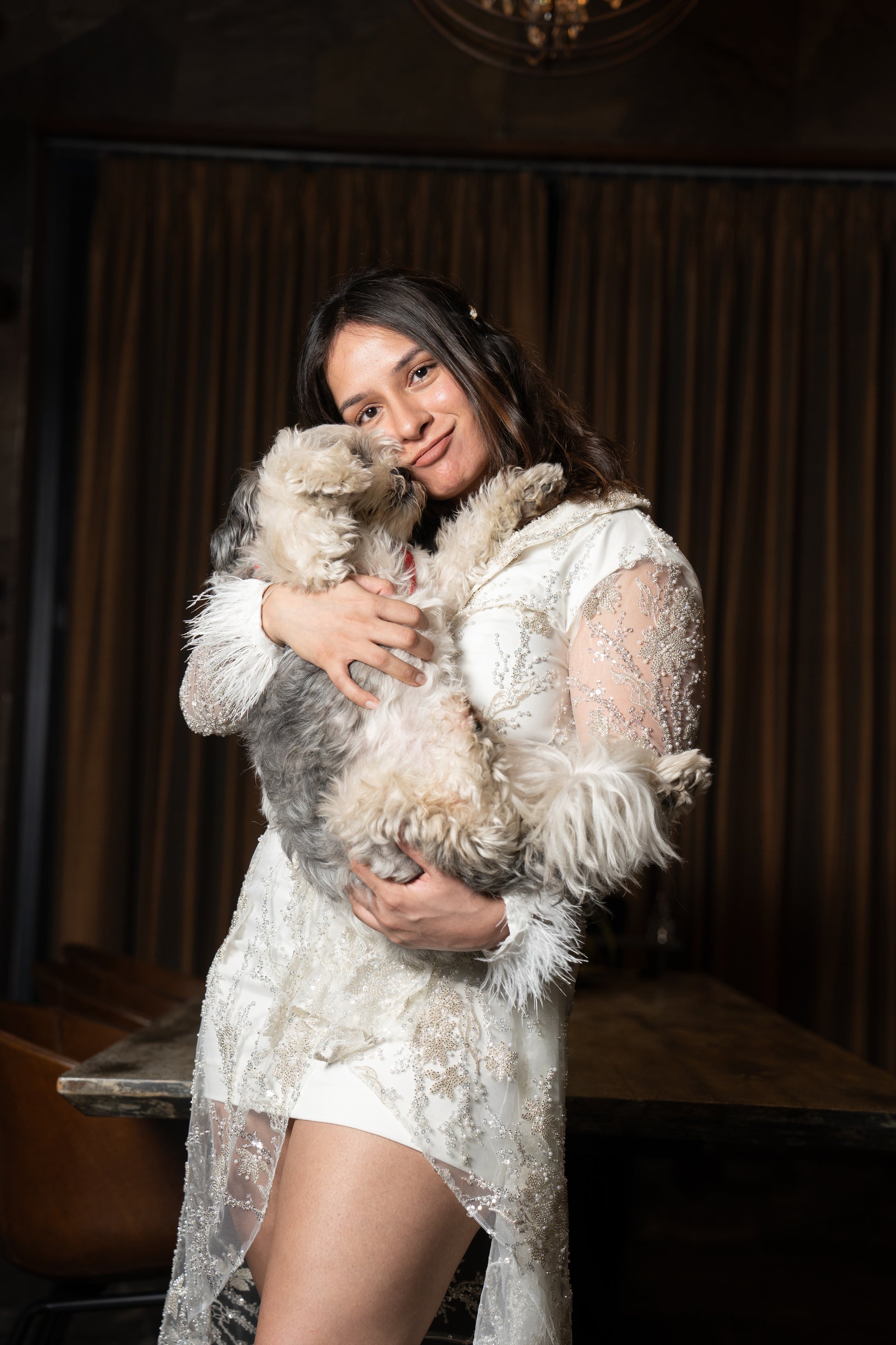 for added drama. A high-low hemline with an asymmetrical drape enhances movement, lending